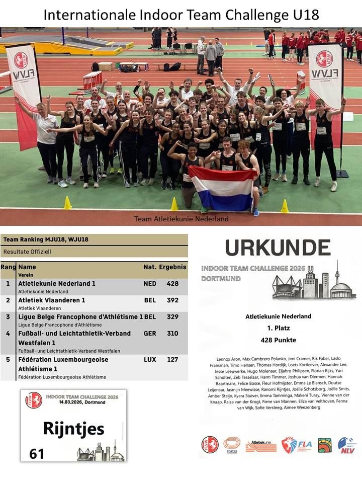 Afgelopen zaterdag 14 maart verzamelden de gouden en zilveren medaillewinnaars van het NK indoor U18 zich al vroeg in de ochtend op nationaal trainingscentrum Papendal. Vanuit daar reisden ze gezamenlijk per bus als Team Nederland af naar de Helmut Körnig Halle in Dortmund waar ze aan een internationale Indoor Team Challenge U18 deelnamen.