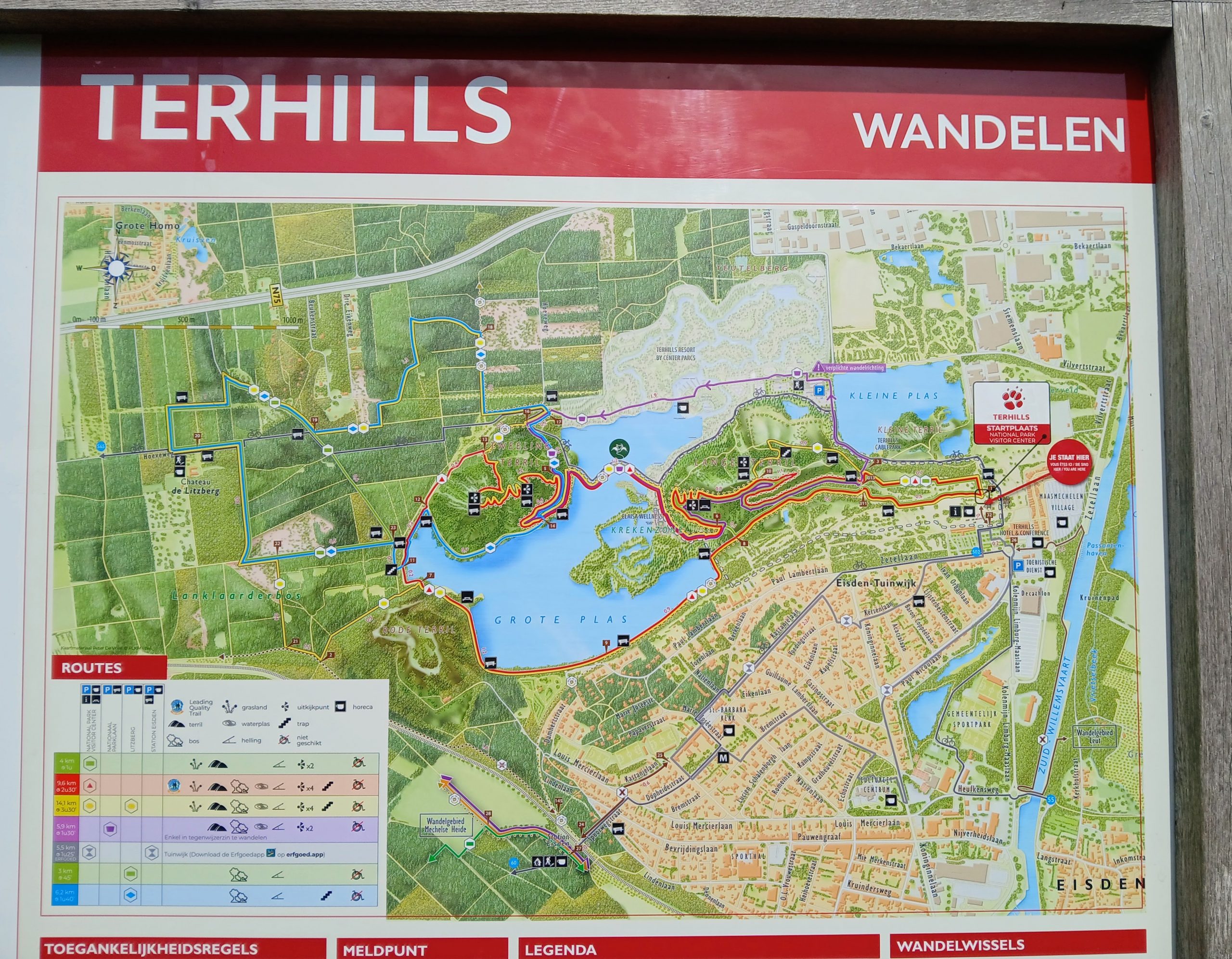 Tegenwoordig is Terhills een prachtig groen recreatiegebied, maar dat was zo’n 40 jaar geleden wel anders. Tot 1987 bevond zich op deze plek een steenkoolmijn. Bij het delven van steenkool kwam mijnsteen vrij, dat werd opgehoopt op de mijnsteenbergen – terrils genoemd. Tijdens de wandeling genieten we dan ook van een rijk landschap van “bergen en meren”: uitgestrekte dennenbossen, grote meren die getuigen van de grind- en zandwinning, de hoge toppen van de mijnsteenbergen. Een van deze heuvels gaan we beklimmen. In het inmiddels grote recreatieterrein wandelen we ook door een gedeelte van het prachtig aangelegde vakantiepark en over een spectaculaire brug op het water. De route heeft twee lussen; een van 9 km en een van ruim 8 km lengte. Bij het visitorcenter kunnen we tijdens de pauze buiten picknicken en in het restaurant iets te drinken halen.