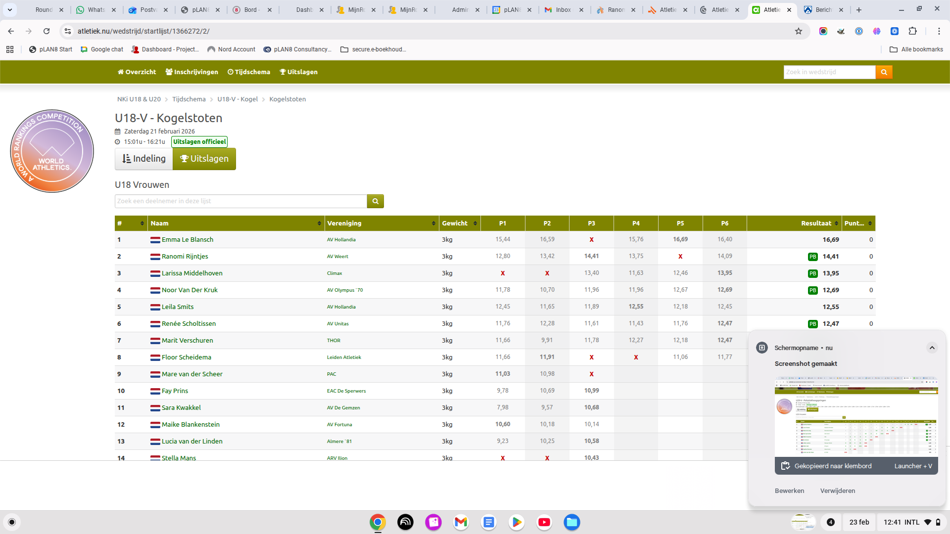 Ranomi wist haar 3kg kogel in haar 3e beurt te stoten tot een afstand van 14.41 meter en kwam hiermee op een prachtige 2e plek in haar categorie.